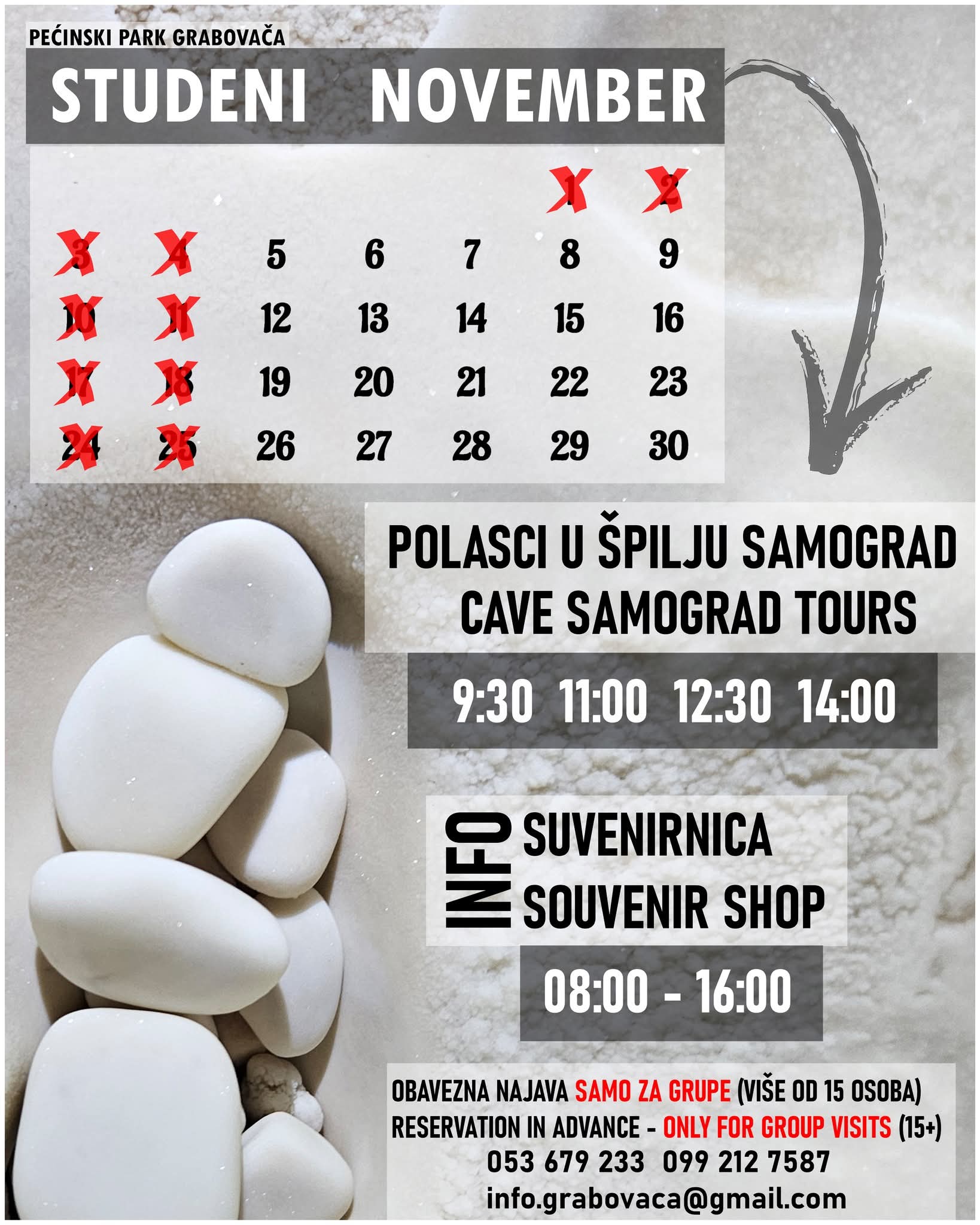 U studenom je Pećinski park Grabovača otvoren za posjetitelje od srijede do nedjelje. Obilasci špilje Samograd održavaju se u terminima u 9:30, 11:00, 12:30 i 14:00 sati. Suven